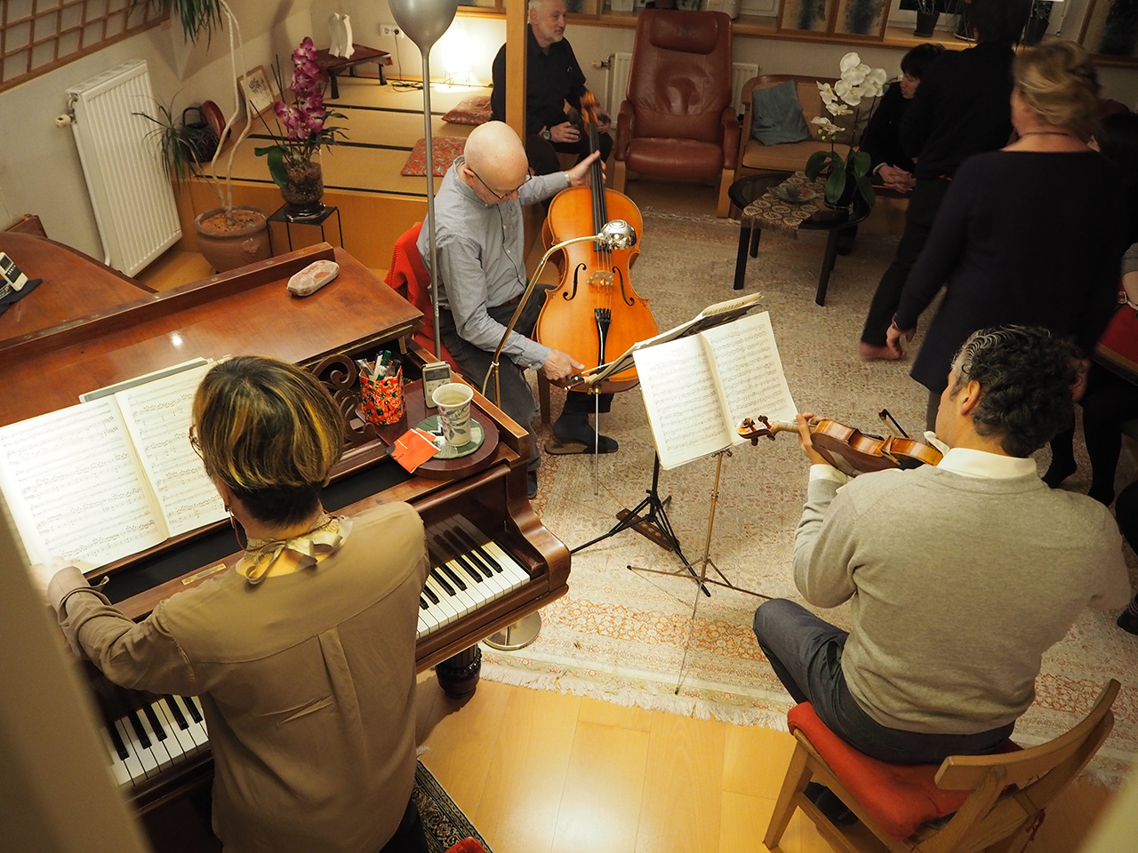 夕方、ウィーン・フィルハーモニー管弦楽団チェロ奏者のイェルゲ・フォグ氏の邸宅にお邪魔し、室内楽演奏会を鑑賞。ベートーヴェンとメンデルスゾーンのピアノ三重奏曲を披露してくださった。(ピアノ:浦田陽子氏、チェロ:イェルゲン・フォグ氏、ヴァイオリン:レミー・バロー氏)かつてのウィーンでの音楽の在り方は今日のように大々的に演奏会を開くよりも室内で家族や友人と楽しむものであった。今ではその文化はほぼ失われてしまったというが、こうして古き良きウィーンの室内楽文化を体験することができた。