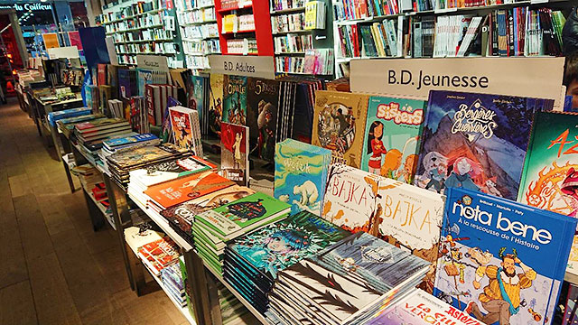 リヨンのある書店におけるBD(バンド・デシネ=フランス語圏の漫画)の陳列。